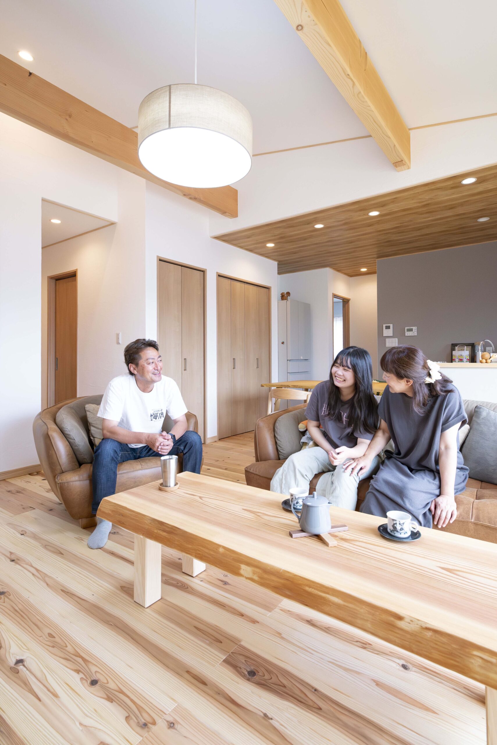 N様が住まいづくりを始めたきっかけは、「今まではアパート住まいでしたが、手狭になってきたことと、子供が友達を気軽に家に呼べるようにしたい」という思いからでした。まずは総合住宅展示場で4社ほど見学され、その日に当社の展示場にもお越しいただきました。その時の感想は、「他社さんは無機質な物に感じましたが、ヤワタホームさんは木がふんだんに使われていて、落ち着く感じがしてよかったです」と好印象だったそうです。その後、何度か展示場にお越しいたいただく中で、より当社を気に入っていただき計画を進めることになりました。担当営業の川嶋について、「フワッとした印象でしたが、私たちの話をよく聞いてくれましたし、自分の会社に対して自信を持っていることがよく伝わってきました」と評価をいただきました。