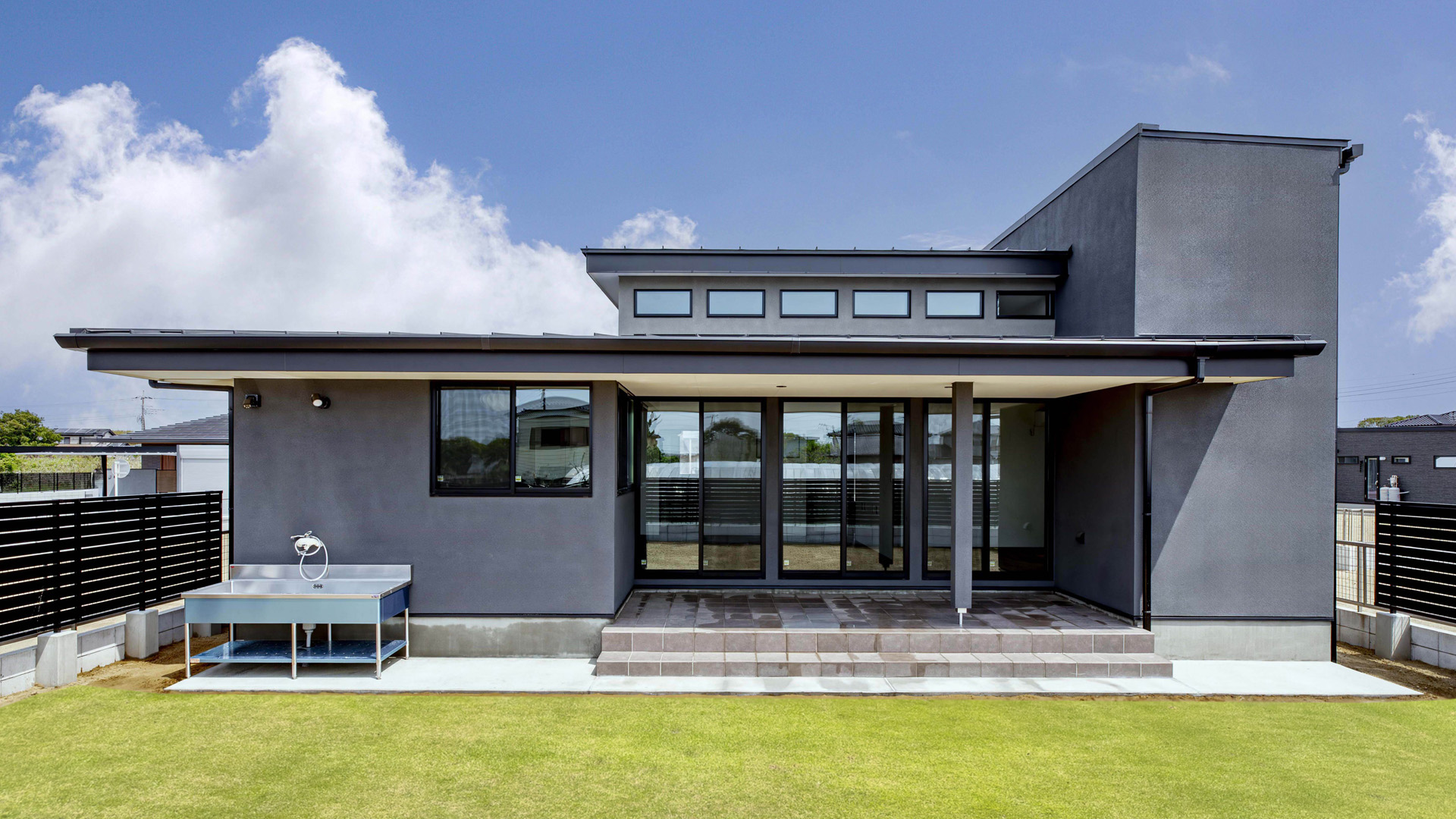 ダークカラーでまとめた外観はモダンながらシックでいつまでも飽きの来ないデザインです。また、玄関側と庭側の表情の違いも印象的です。庭側には趣味の釣り道具を洗うための流し台も付いています。